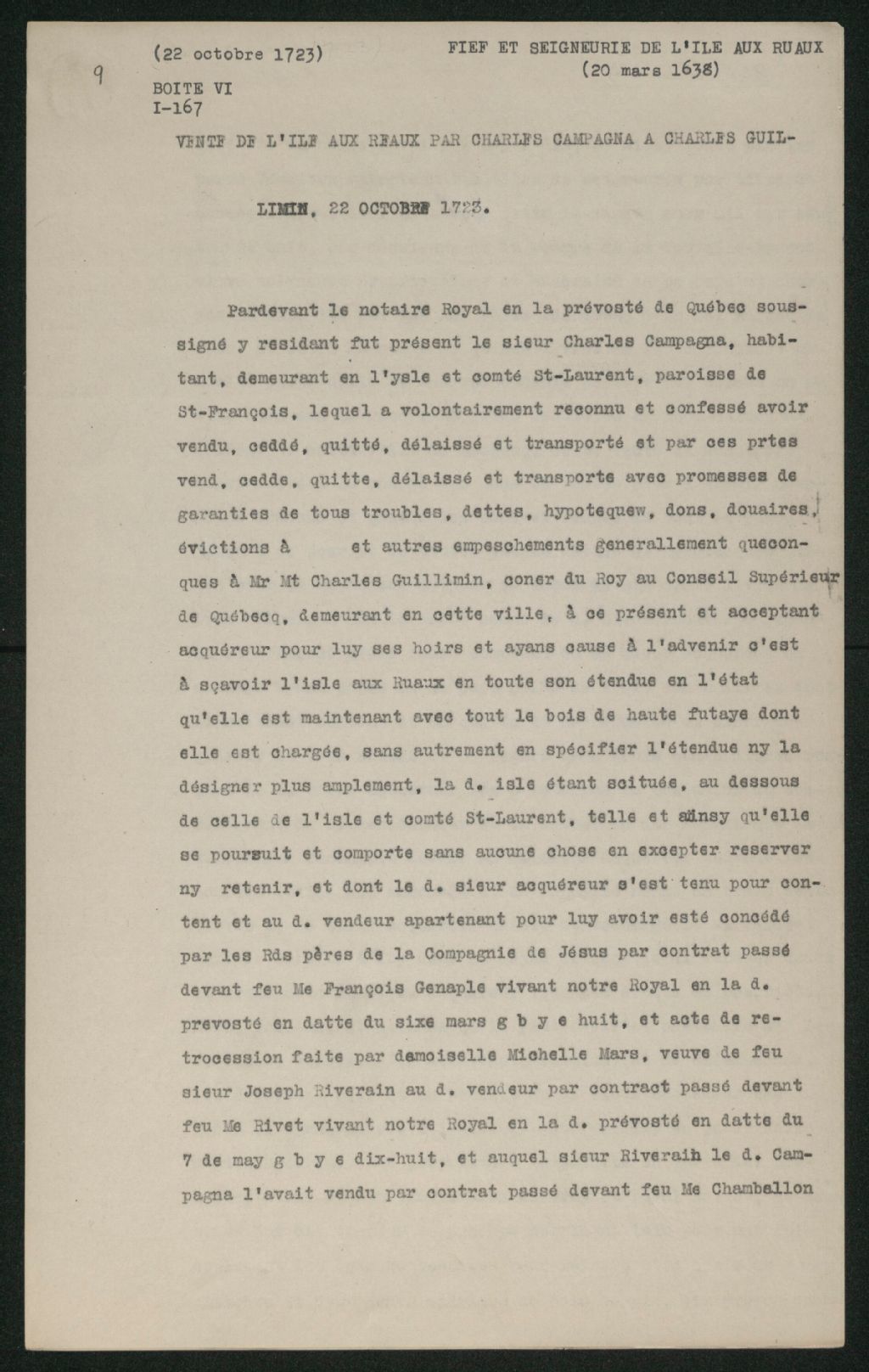Acte de vente de Charles Campagna, habitant, demeurant en l'île et comté de Saint-Laurent, paroisse Saint-François, à Charles Guillimin, conseiller au Conseil Supérieur de Québec, de l'île aux Ruaux., Copie dactylographiée en [19-] (original créé le 22 octobre 1723), Archives nationales à Québec, Collection Seigneuries, (03Q,P240,D117,P9).