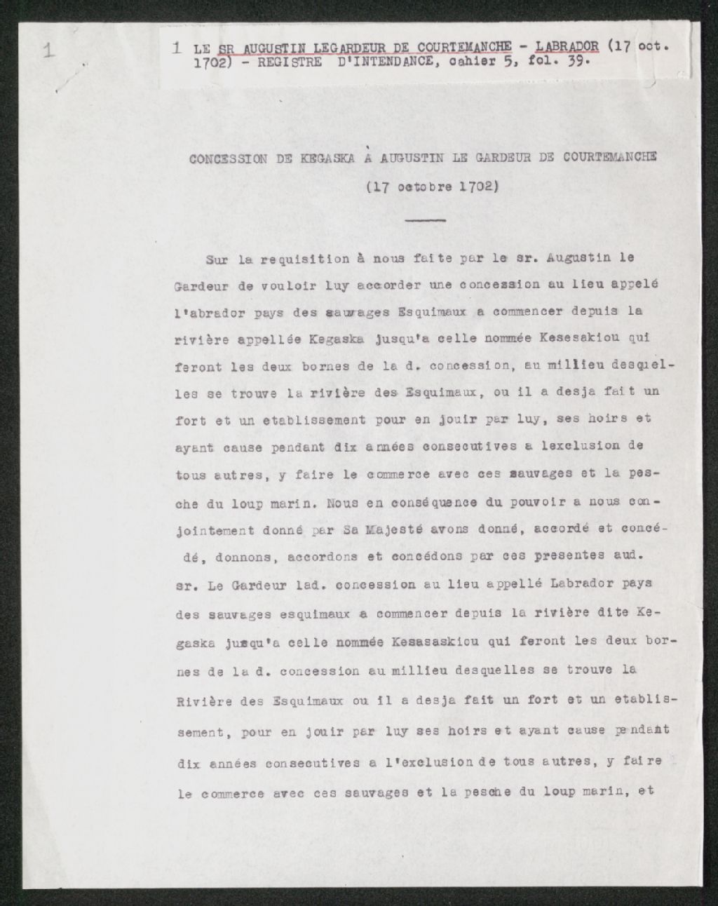 Concession à Augustin Legardeur de Courtemanche : Kegaska, Copie dactylographiée en [19-] (original créé le 17 octobre 1702), Archives nationales à Québec, Collection Seigneuries, (03Q,P240,D173,P1).