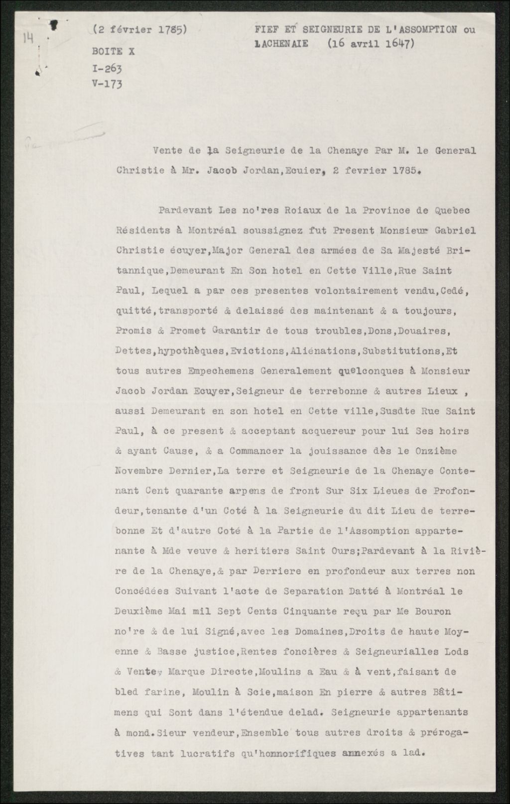 Vente par Gabriel Christie à Jacob Jordan: seigneurie de Lachenaie, Copie dactylographiée en [19-] (original créé le 2 février 1785), Archives nationales à Québec, Collection Seigneuries, (03Q,P240,D174,P14).