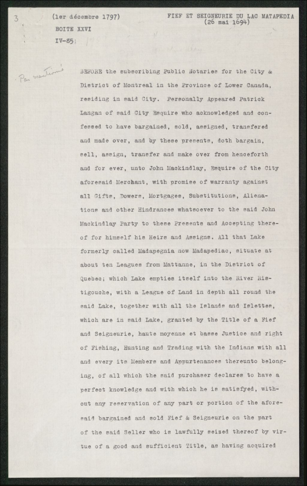 Vente par Patrick Langan à John MacKindlay, Copie dactylographiée en [19-] original créé le 1er décembre 1797, Archives nationales à Québec, Collection Seigneuries, (03Q,P240,D175,P3).
