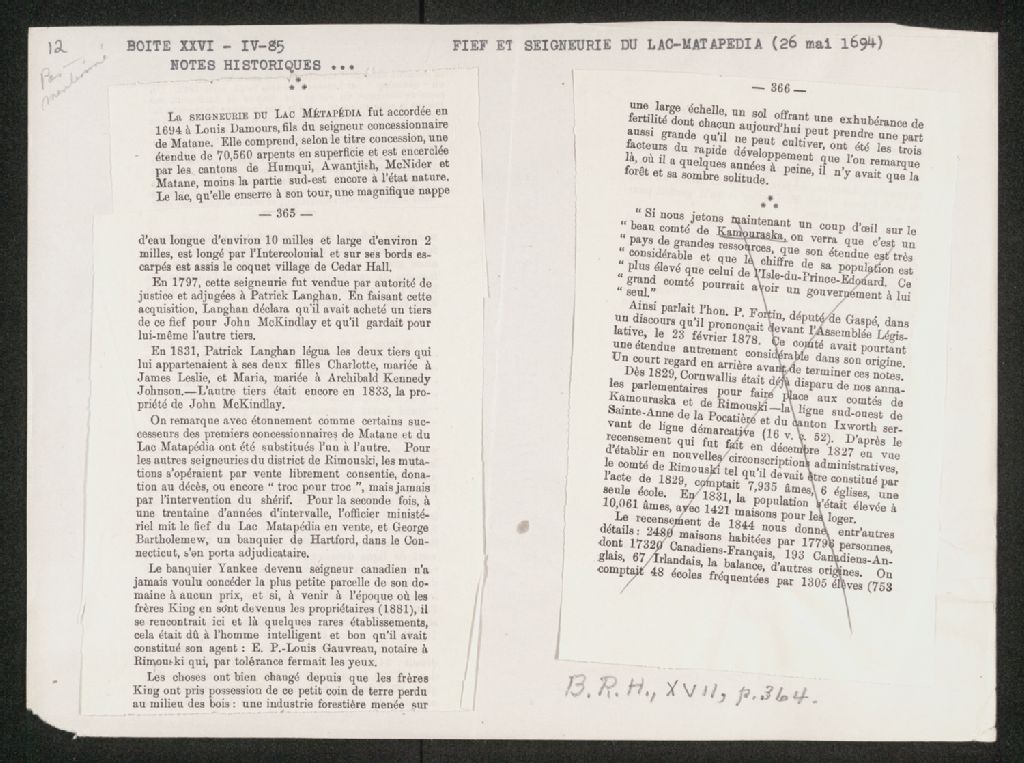 Documents de travail, sans date. Extrait du Bulletin des recherches historiques (BRH) sur cette seigneurie
