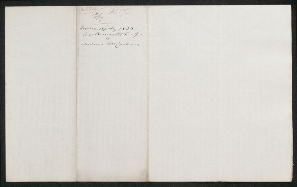 Lettre de Joseph Bouchette à Andrew McCachran, 18 juillet 1825, Archives nationales à Québec, Collection Seigneuries, (03Q,P240,D179,P12).