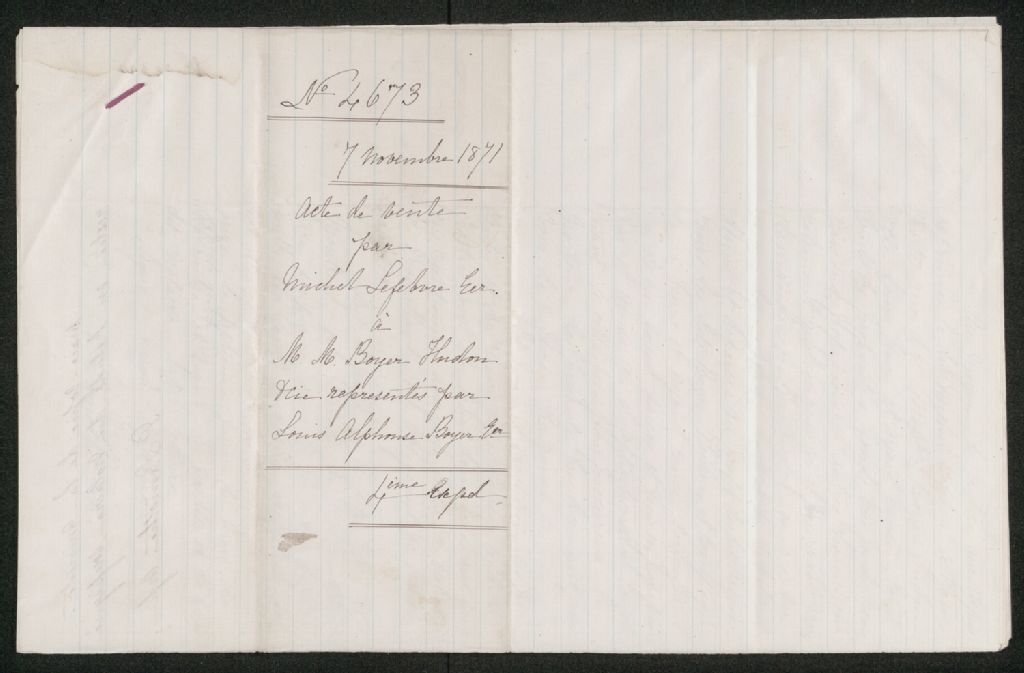 Vente par Michel Lefebvre à Louis Alphonse Boyer et al., 7 novembre 1871, Archives nationales à Québec, Collection Seigneuries, (03Q,P240,D179,P21).