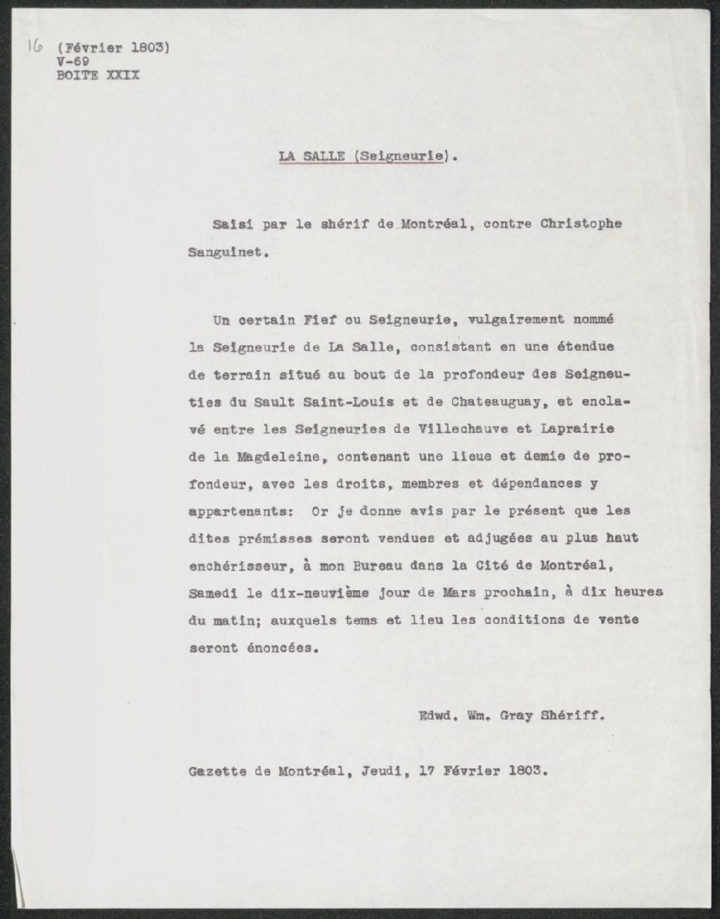 Extrait du journal La Gazette de Québec : Saisie par le shérif de Montréal contre Christophe Sanguinet