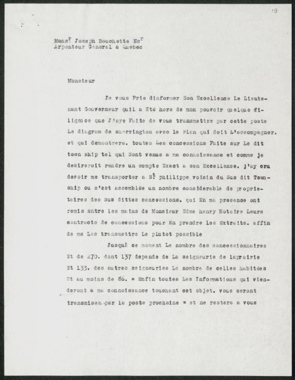 Lettre de Maurice Blondeau à Joseph Bouchette, Copie dactylographiée en [19-] original créé le 15 décembre 1803, Archives nationales à Québec, Collection Seigneuries, (03Q,P240,D182,P18).