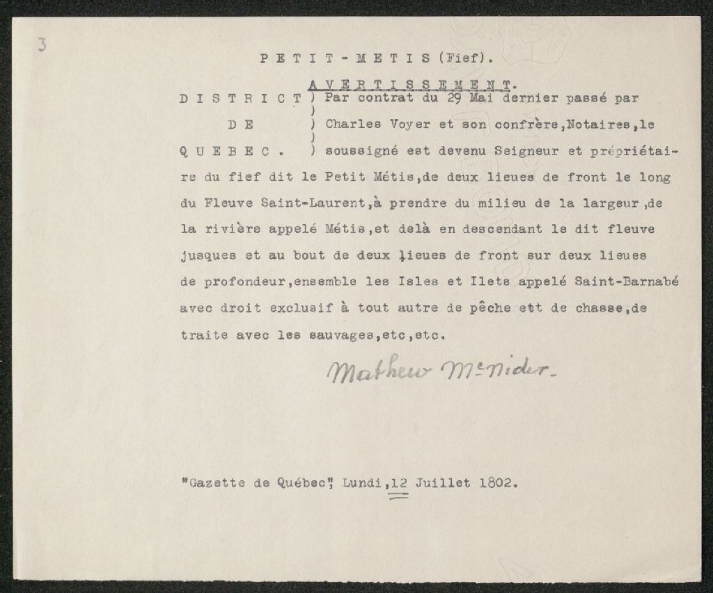 Extrait du journal La Gazette de Québec : "Avertissement" que Mathew McNider est devenu propriétaire du fief Petit Métis