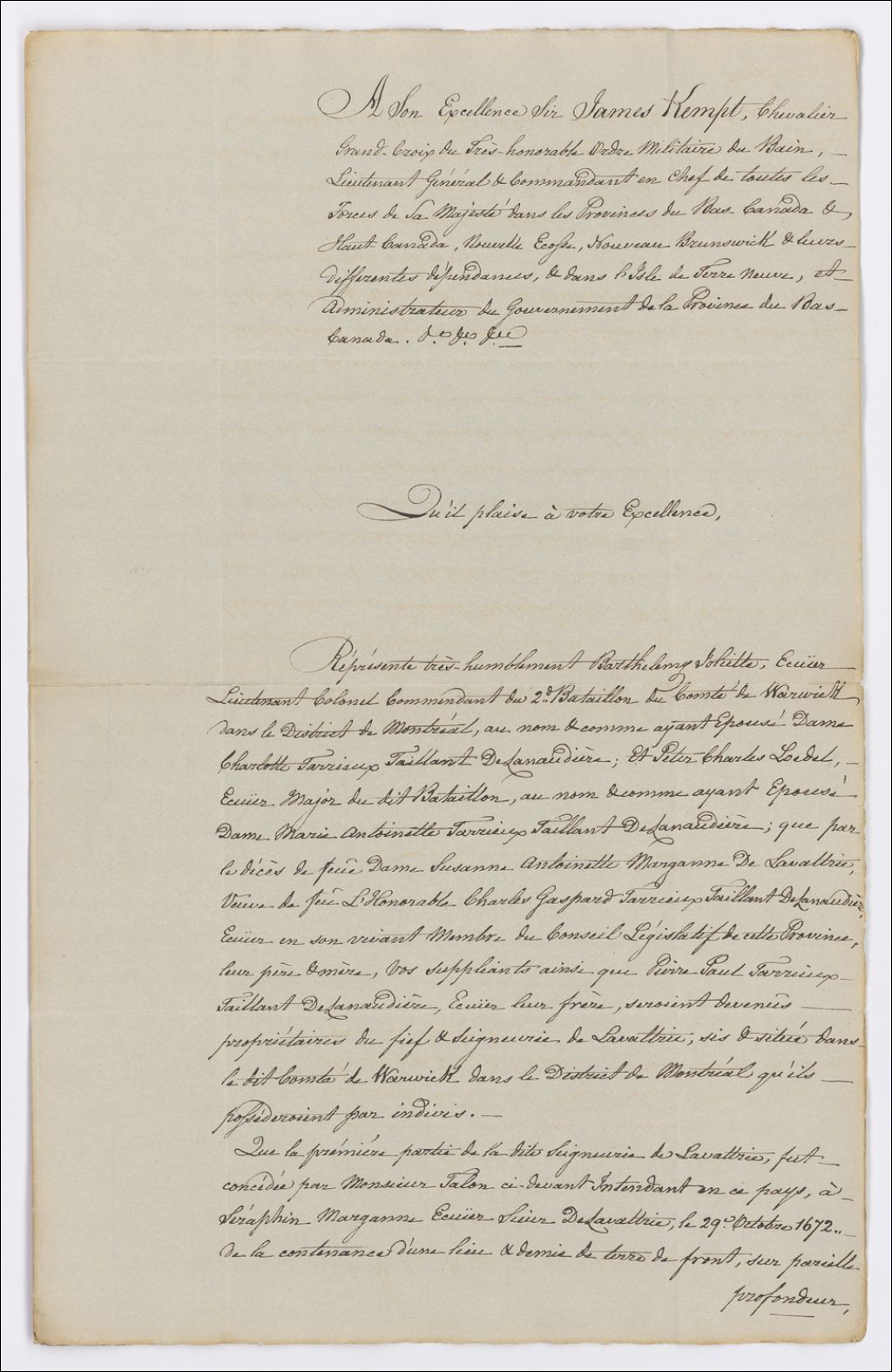 Requête de Barthélemy Joliette et Peter Charles Loedel au gouverneur Kempt : Admission à la foi et hommage, 25 mai 1825, Archives nationales à Québec, Collection Seigneuries, (03Q,P240,D189,P9).