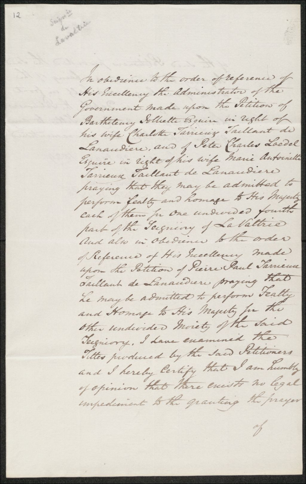 Réponse à la requête Barthélemy Joliette et Peter Charles Loedel : Admission à la foi et hommage, 28 mai 1829, Archives nationales à Québec, Collection Seigneuries, (03Q,P240,D189,P12).