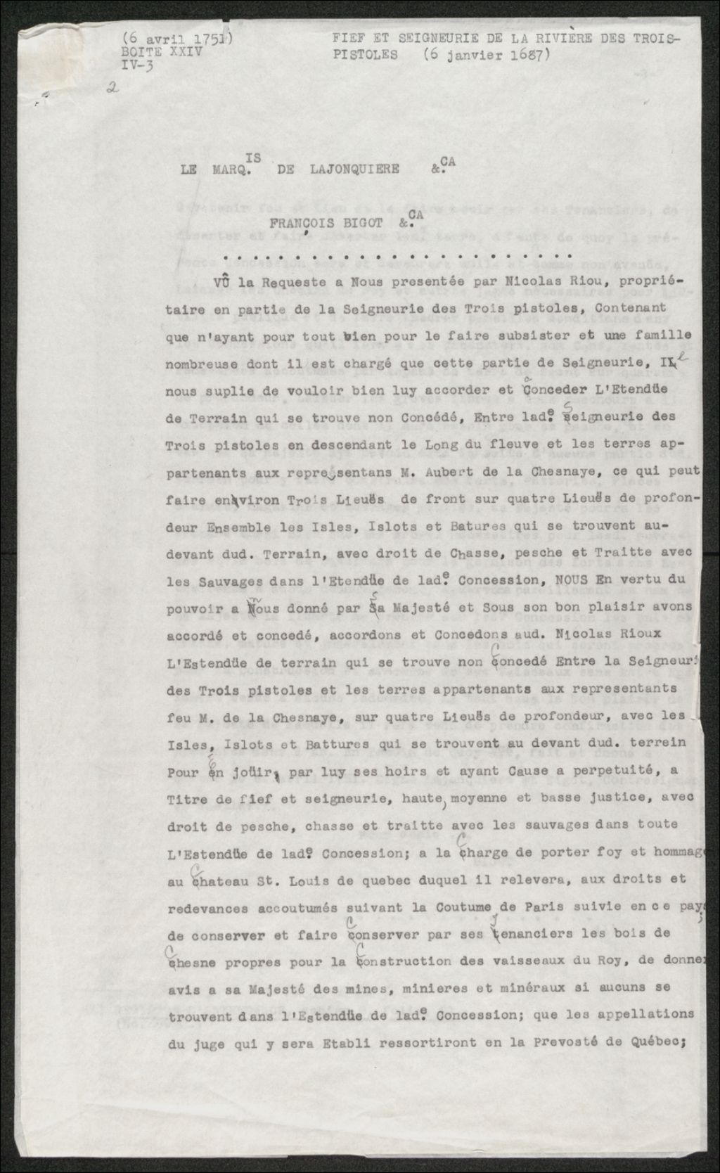 Réponse par François Bigot à une requête de Nicolas Rioux : Demande de concession, 6 avril 1751, Archives nationales à Québec, Collection Seigneuries, (03Q,P240,D301,P2).