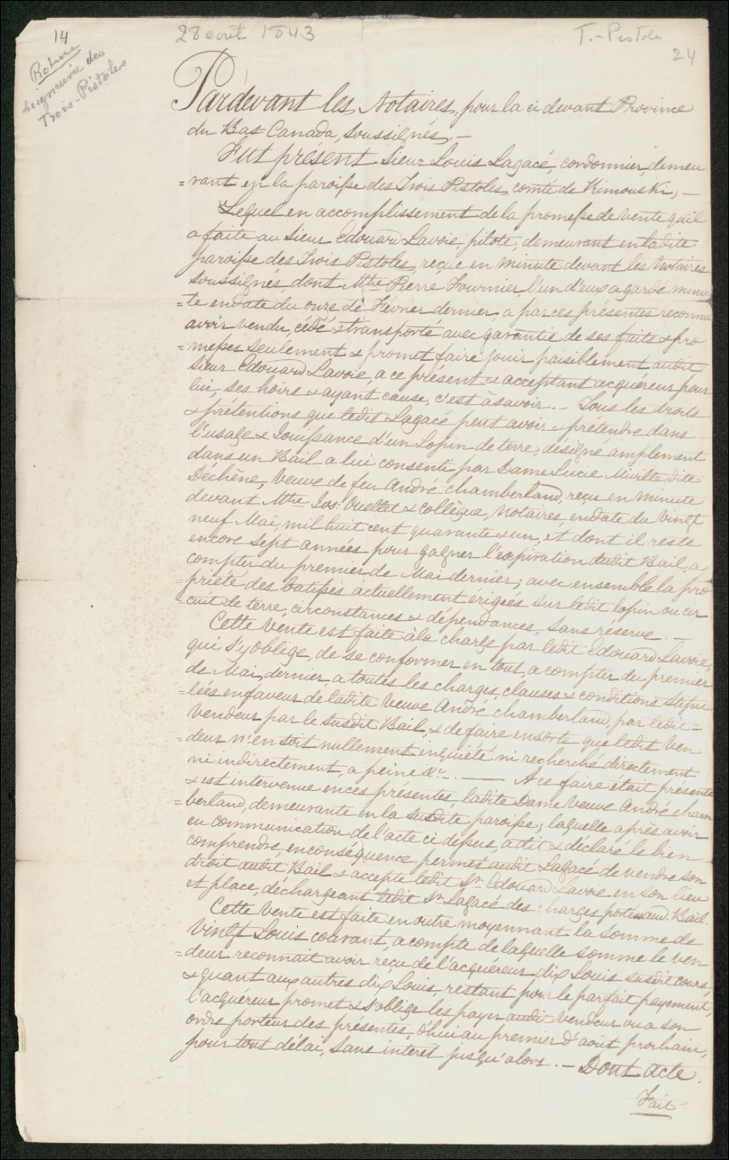 Vente par Louis Lagacé à Édouard Lavoie : Vente de bail, 28 août 1843, Archives nationales à Québec, Collection Seigneuries, (03Q,P240,D301,P14).