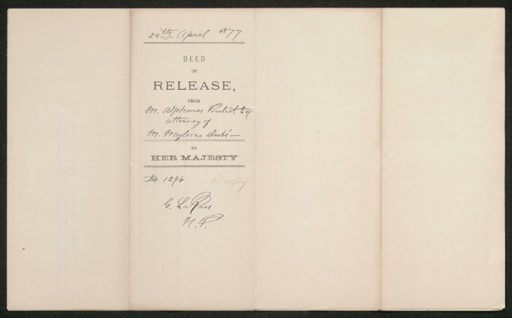 Quittance par Alphonse Pouliot, procureur de Magloire Dubé, 24 avril 1877, Archives nationales à Québec, Collection Seigneuries, (03Q,P240,D301,P26).