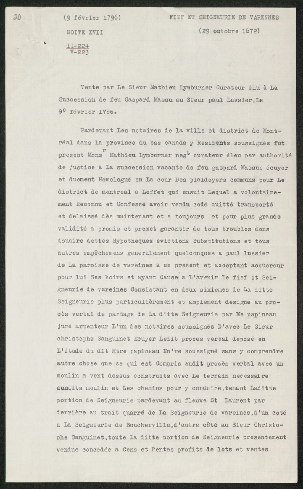 - Vente par Mathieu Lymburner, curateur de la succession vacante de Gaspard Massue, à Paul Lussier