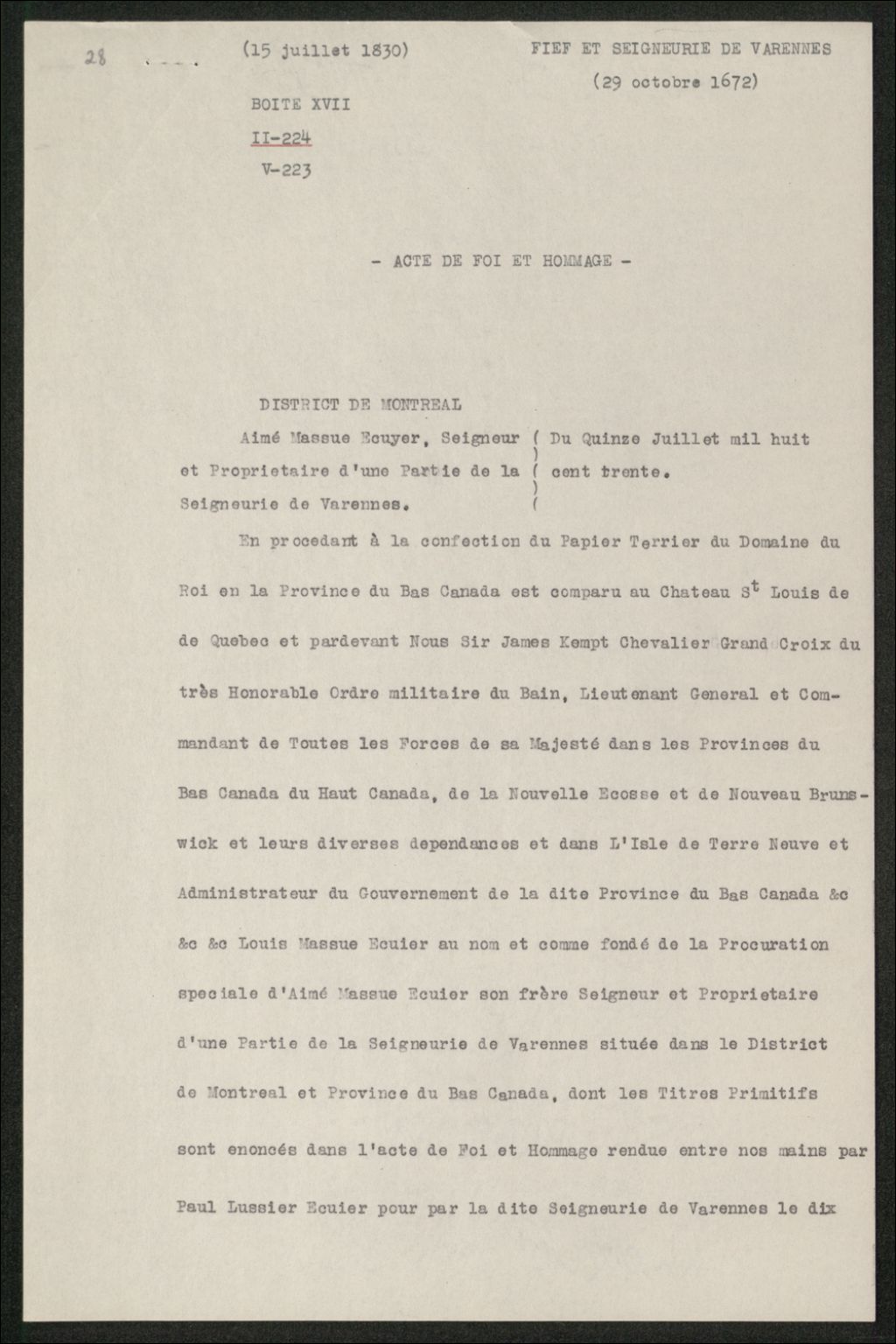 Acte de foi et hommage d'Aimé Massue, 15 juillet 1830, Archives nationales à Québec, Collection Seigneuries, (03Q,P240,D303,P28).