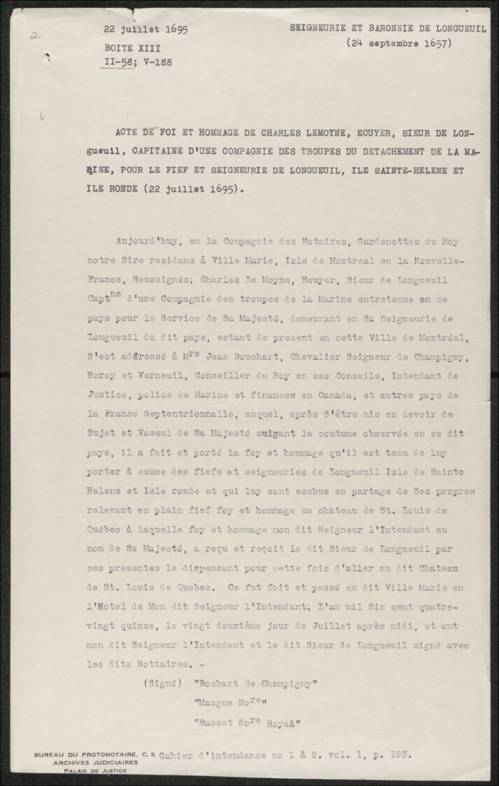 Acte de foi et hommage de Charles Lemoyne, écuyer, sieur de Longueuil, capitaine d'une compagnie des troupes du détachement de la marine, pour le fief et seigneurie de Longueuil, île Sainte-Hélène et île Ronde