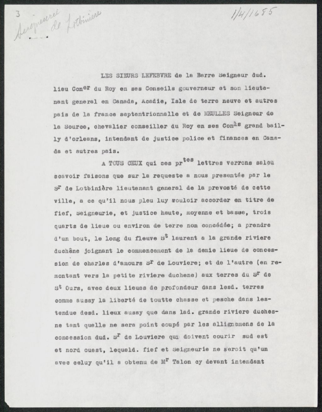 - Le titre complet de la pièce se lit comme suit : Acte de concession de MM. Lefebvre de la Barre et de Meulles, gouverneur et intendant de la Nouvelle-France, au sieur de Lotbinière, lieutenant général de la Prévôté de Québec, de "trois quarts de lieue ou environ de terre de front, non concédée, qui se rencontre le long du fleuve St-Laurent à prendre d'un costé, le long du fleuve St-Laurent, à la grande rivière du Chêne joignant le commencement de la demie lieue de terre du sieur Damours de Louvière et de l'autre, en remontant à la petite rivière du Chesne, aux terre du sieur de Saint-Ours, avec deux lieues de profondeur, lequel fief et seigneurie sera joint, uny et incorporé avec celuy que le dit sieur de Lotbinière possède entre la concession des Religieuses Ursulines et celle du sieur Damours de Louvière, pour ne faire qu'un même fief et justice..." En titre de fief, seigneurie et justice