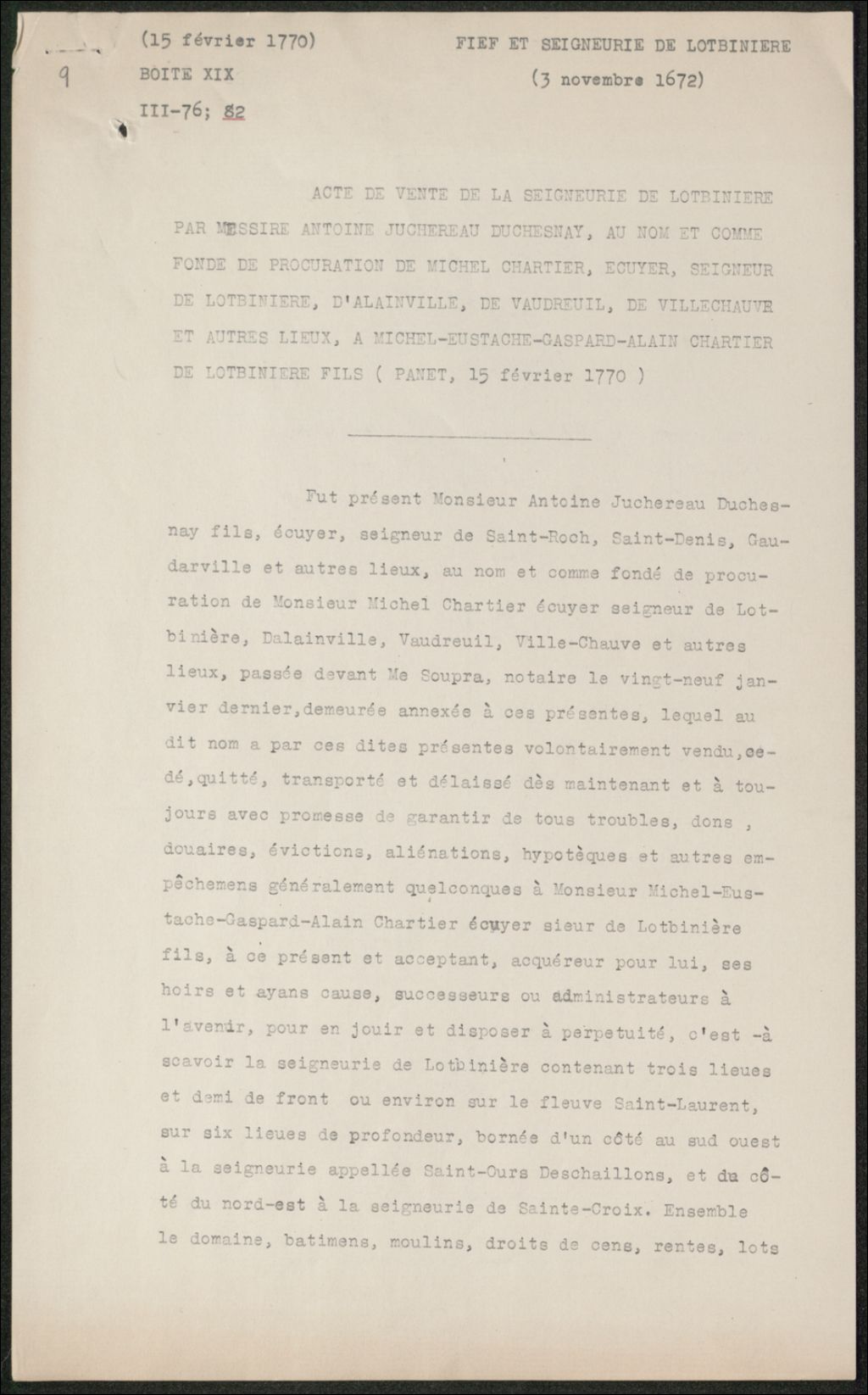- Vente par Michel Chartier de Lotbinière à Michel-Eustache-Gaspard-Alain Chartier de Lotbinière fils