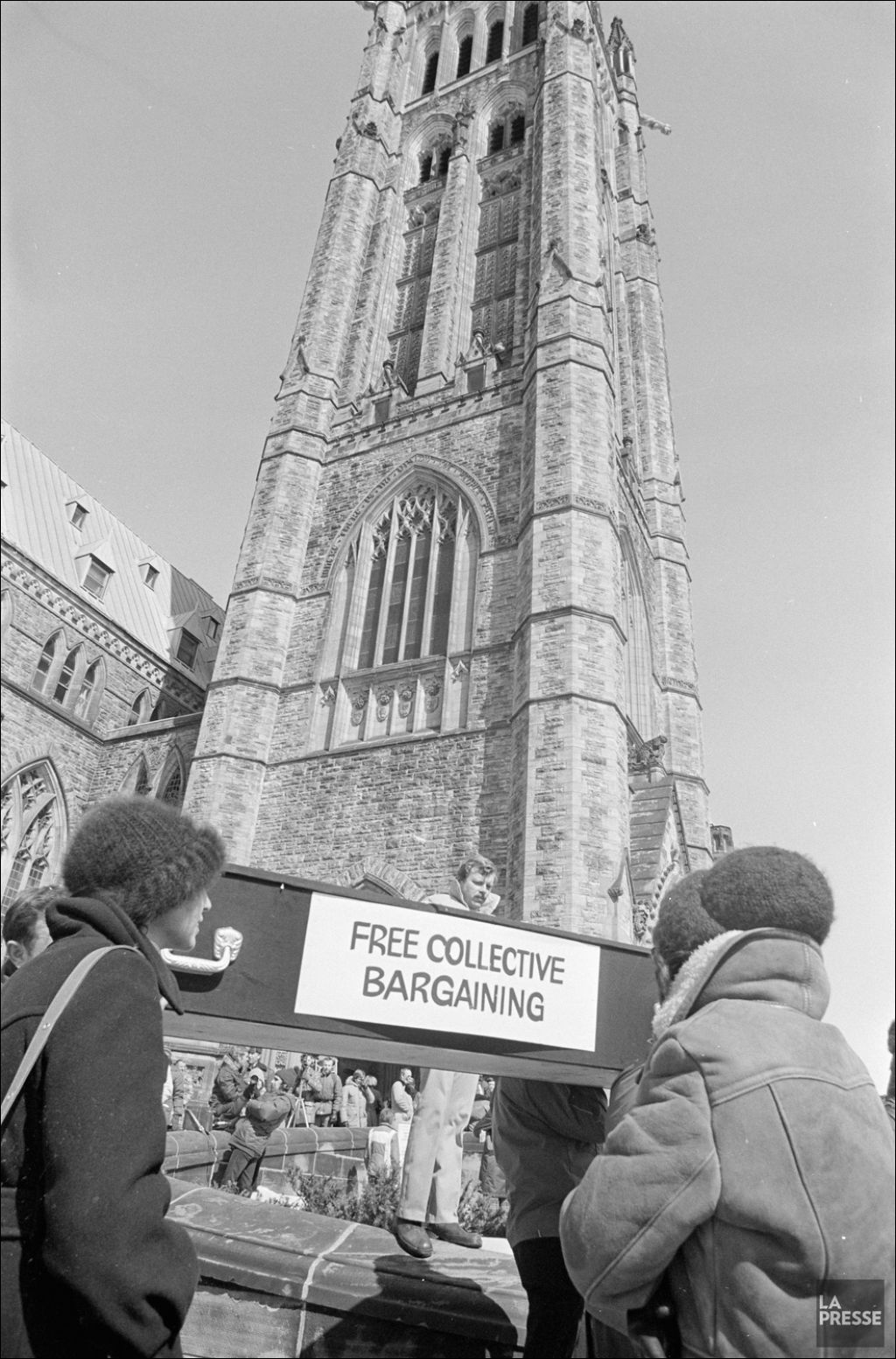- Le dossier témoigne d'une manifestation des membres de la Confédération des syndicats nationaux (CSN), de la Fédération des travailleurs du Québec (FTQ) et de la Corporation des enseignants du Québec (CEQ) sur la colline du Parlement à Ottawa. La manifestation porte sur la Commission de contrôle et de surveillance des prix et des salaires