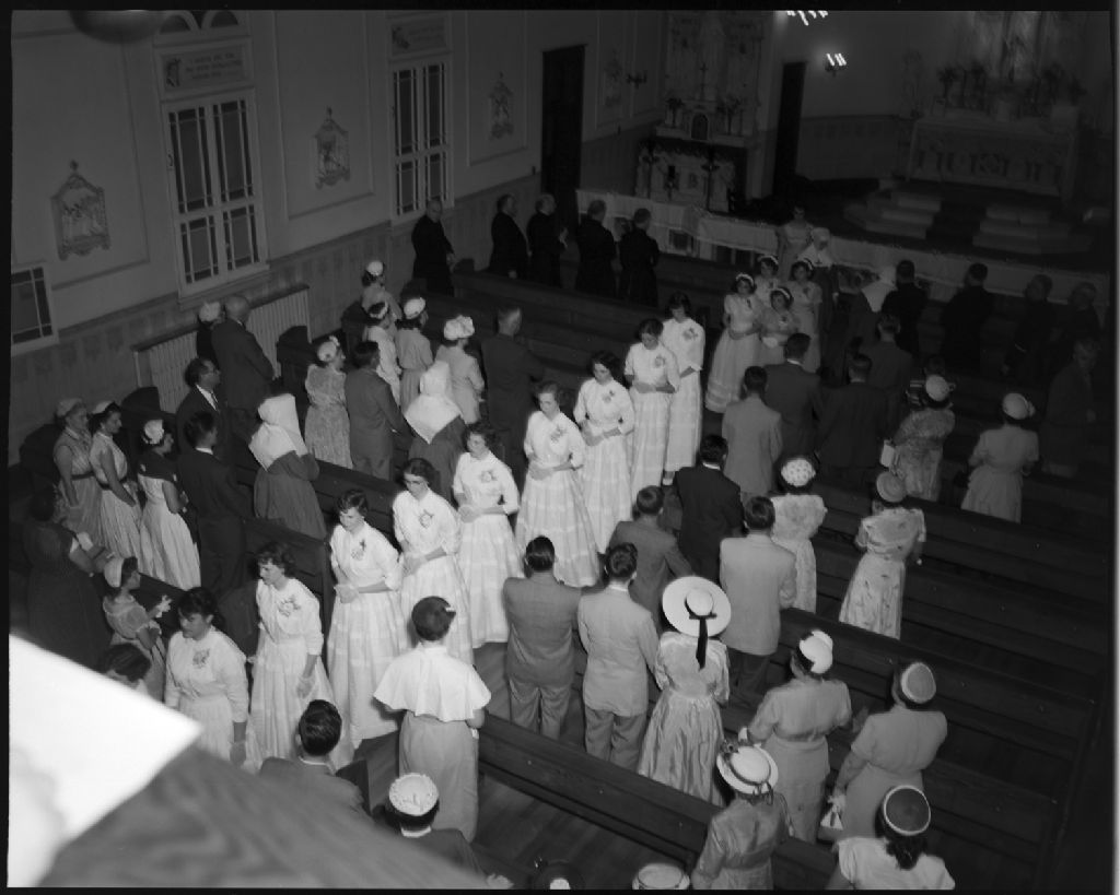 Graduation au sous-sol de l'Église Notre-Dame-de-Lourdes de Vanier, 23 juin 1953, Archives nationales à Gatineau, Fonds Champlain Marcil, (07H,P174,S1,D1576), Attribuée à Champlain Marcil.