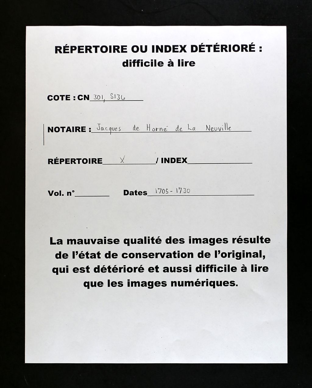 Jacques de Horné de LaNeuville, 1705-1727, Archives nationales à Québec, Fonds Cour supérieure. District judiciaire de Québec. Greffes de notaires, (03Q,CN301,S136).