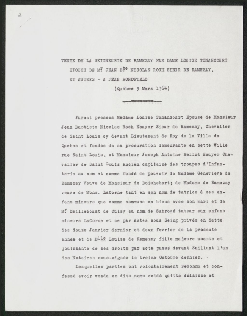 Vente de la seigneurie de Ramezay par Louise Tonnancour (Tonancourt) à Jean Bondfield