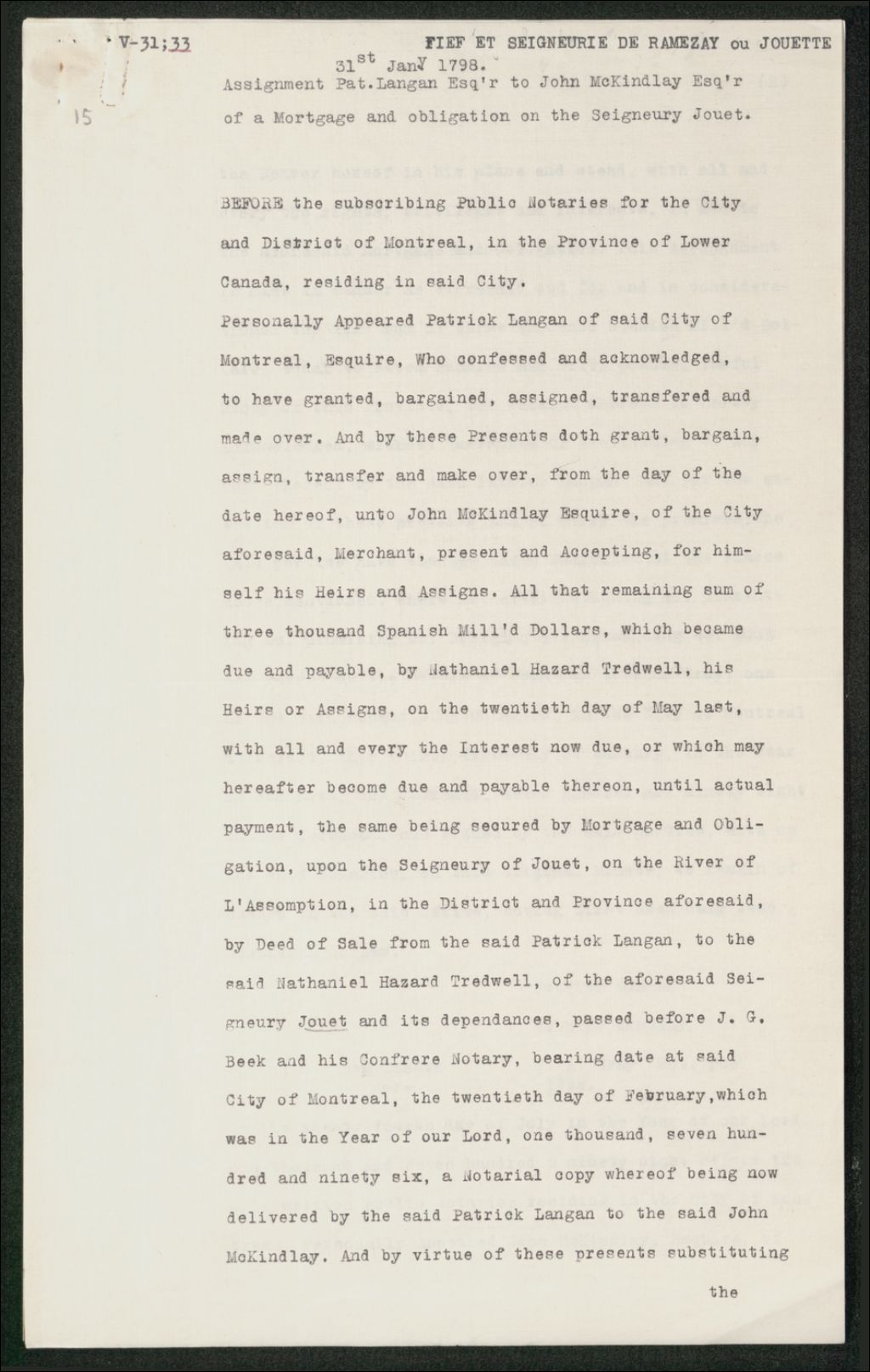 "Assignment of a Mortgage and obligation" de Patrick Langan à John McKindlay, Copie dactylographiée en [19-] (original créé en 1798-1799), Archives nationales à Québec, Collection Seigneuries, (03Q,P240,D239,P15).