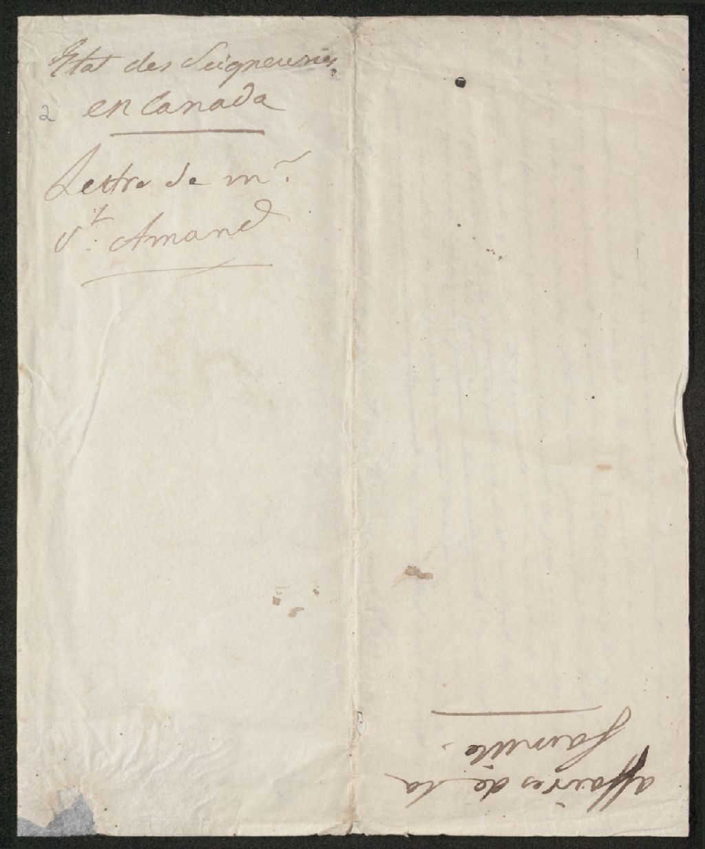 Rapport de M. Saint-Amand : «État des seigneuries appartenant à la succession Léry en Canada» (Seigneurie de Rigaud-Vaudreuil en Beauce, fief Sainte-Barbe ou La Famine en Beauce, seigneurie de Gentilly, seigneurie de Legardeur, fief Beauvais, fief Perthuis et quatre moulins)