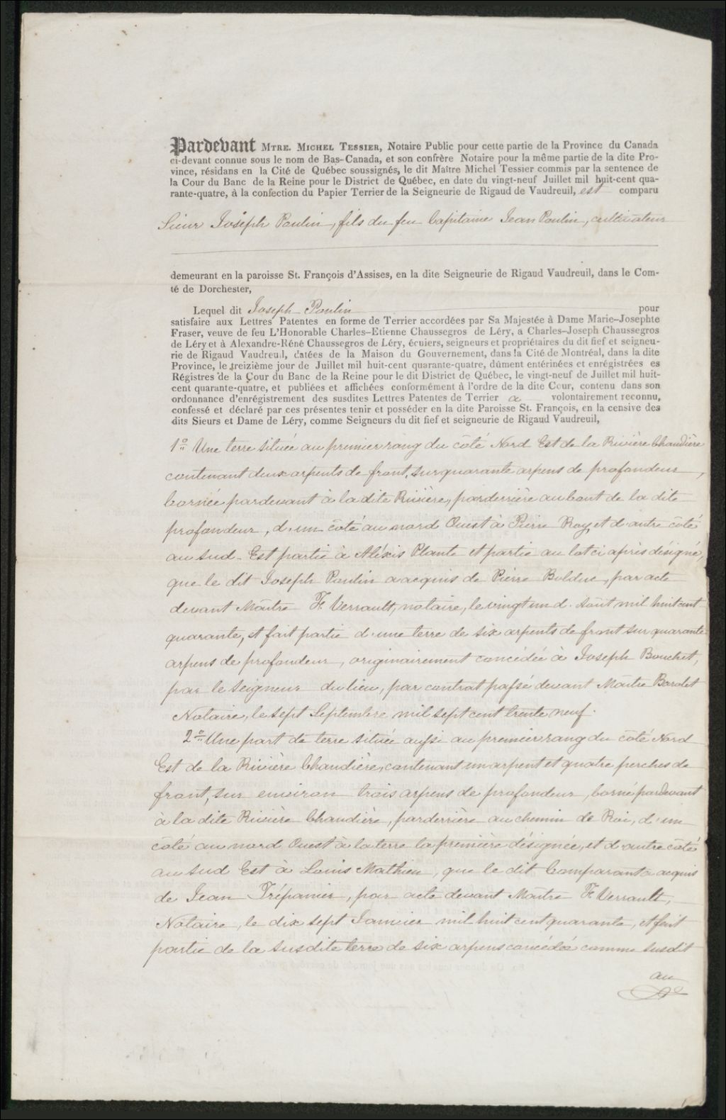 Déclaration (titre nouvel) par Joseph Poulin en faveur de dame Marie-Josephte Fraser, veuve de feu Charles-Étienne Chaussegros de Léry, Charles-Joseph et Alexandre René Chaussegros de Léry, seigneurs de Rigaud-Vaudreuil, 24 juin 1845, Archives nationales à Québec, Collection Seigneuries, (03Q,P240,D242,P19).