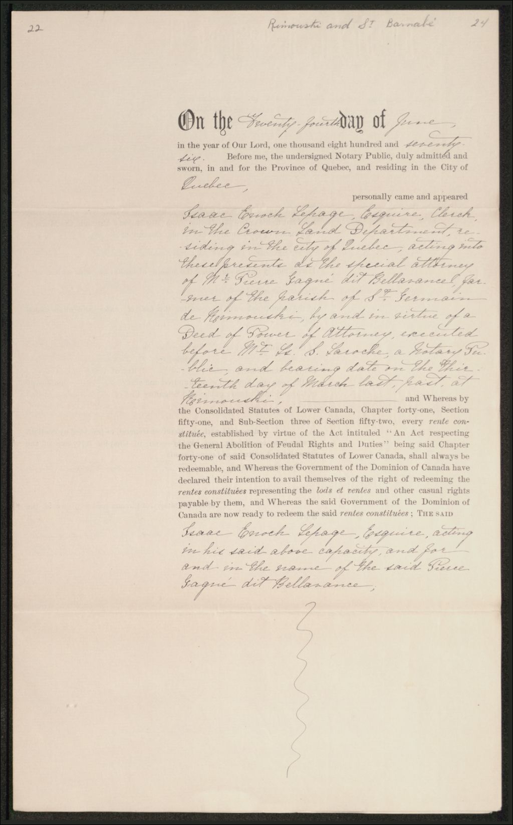 Quittance par Isaac Enoch Lepage mandataire de Pierre Gagné dit Bellavance, 24 juin 1876, Archives nationales à Québec, Collection Seigneuries, (03Q,P240,D243,P22).