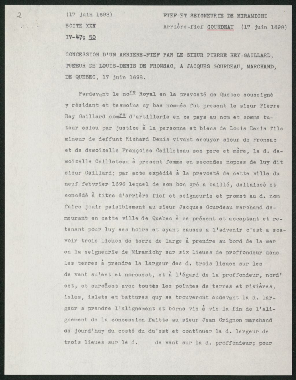 Le titre complet de la pièce se lit comme suit : Concession de Pierre Rey Gaillard, commissaire d'artillerie en ce pays, au nom et comme tuteur élu par justice, à Louis Denys, fils mineur de défunt Richard Denys, sieur de Fronsac, et de Françoise Cailleteau, à Jacques Gourdeau, marchand, de Québec, d'un arrière-fief et seigneurie, savoir "trois lieues de terre de large à prendre au bord de la mer, en la seigneurie de Miramichi, sur six lieues de profondeur dans les terres à prendre la largeur des d. trois lieues sur les rhumbs de vent sudest et norouest et à l'égard de la profondeur nordest et surouest avec toutes les pointes de terres et rivières, îles, îlets et battures qui se trouveront audevant la d. largeur, à prendre l'alignement de la concession faite au sieur Jean Grignon ce jourd'hui du côté du ouest et continuer la d. largeur de trois lieues sur le d. rhumb de vent sur la d. profondeur..."