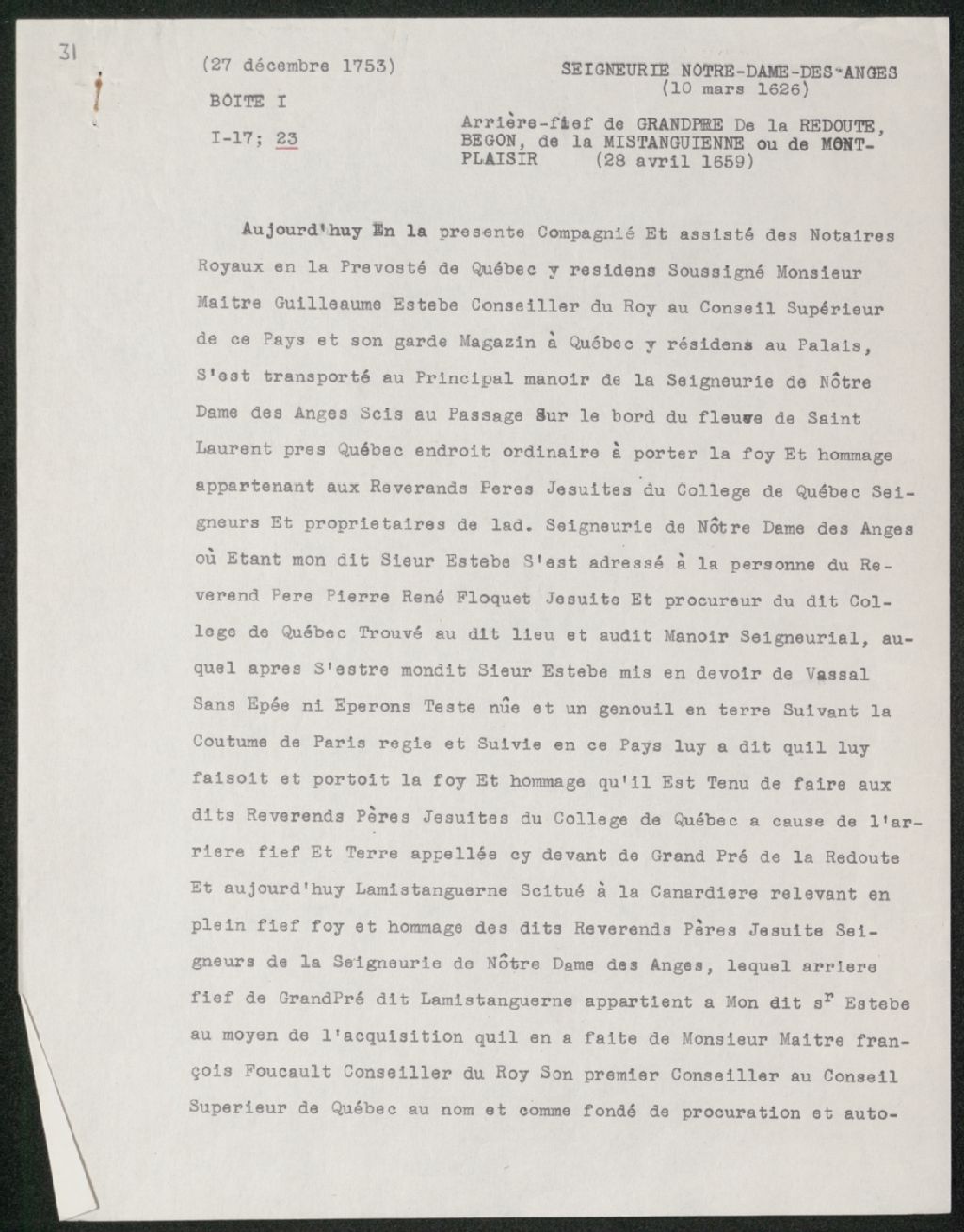 Acte de foi et hommage de Guillaume Estèbe, conseiller au Conseil Supérieur de Québec et garde-magasin à Québec, au R. P. Pierre-René Floquet, procureur du collège de Québec, pour l'arrière-fief et terre appelé ci-devant de Grand-Pré de la Redoute et aujourd'hui la Mistanguienne, situé à la Canardière, relevant de la seigneurie de Notre-Dame-des-Anges, Copie dactylographiée en [19-] original créé le 27 décembre 1753, Archives nationales à Québec, Collection Seigneuries, (03Q,P240,D220,P31).