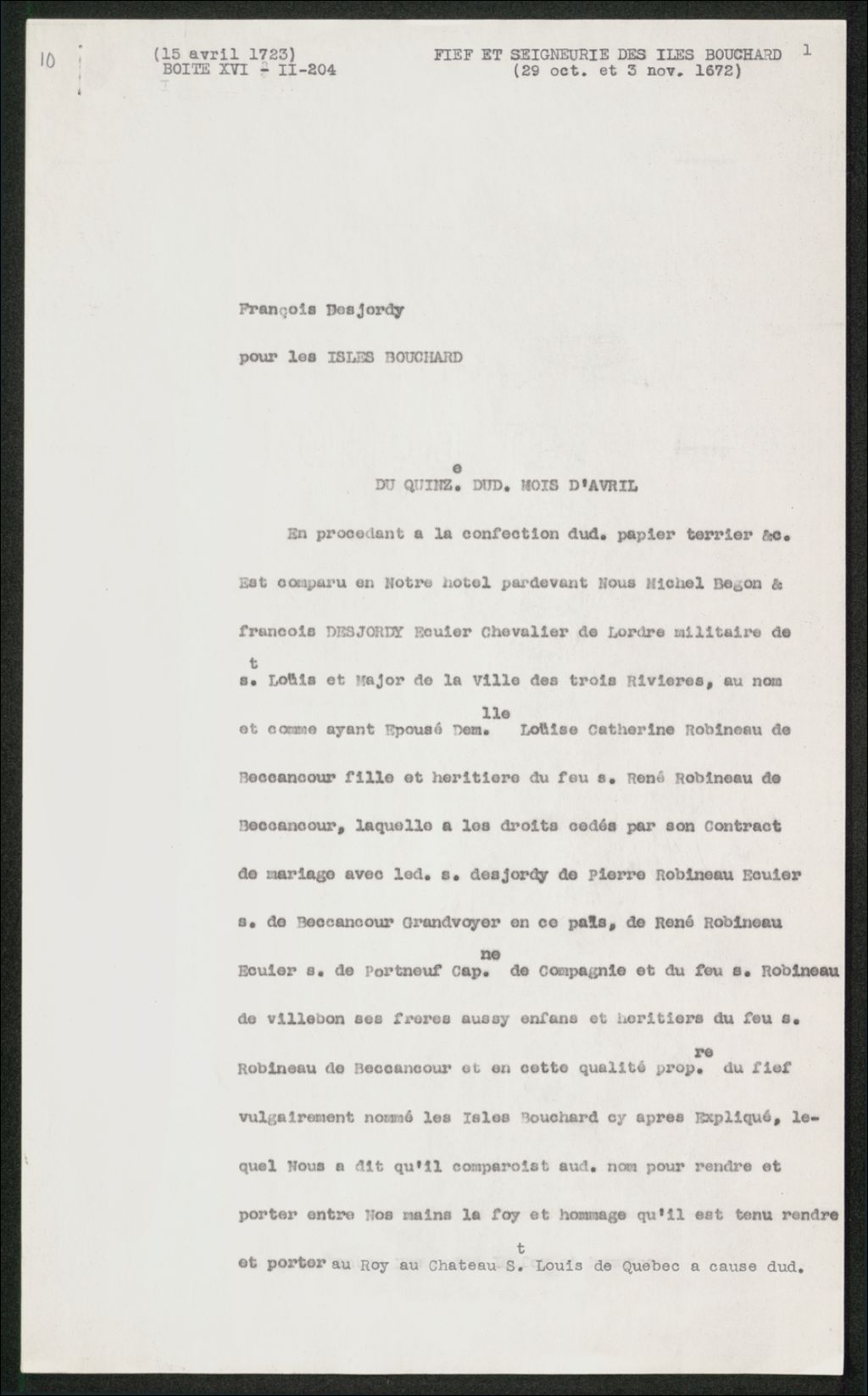 - Acte de foi et hommage de François Desjordy, chevalier de St-Louis, major des Trois-Rivières