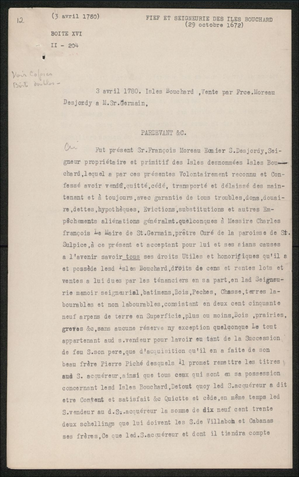 Vente de François Moreau Desjordy à Charles-François Lemaire de Saint-Germain, Copie dactylographiée en [19-] (original créé le 3 avril 1780), Archives nationales à Québec, Collection Seigneuries, (03Q,P240,D165,P12).