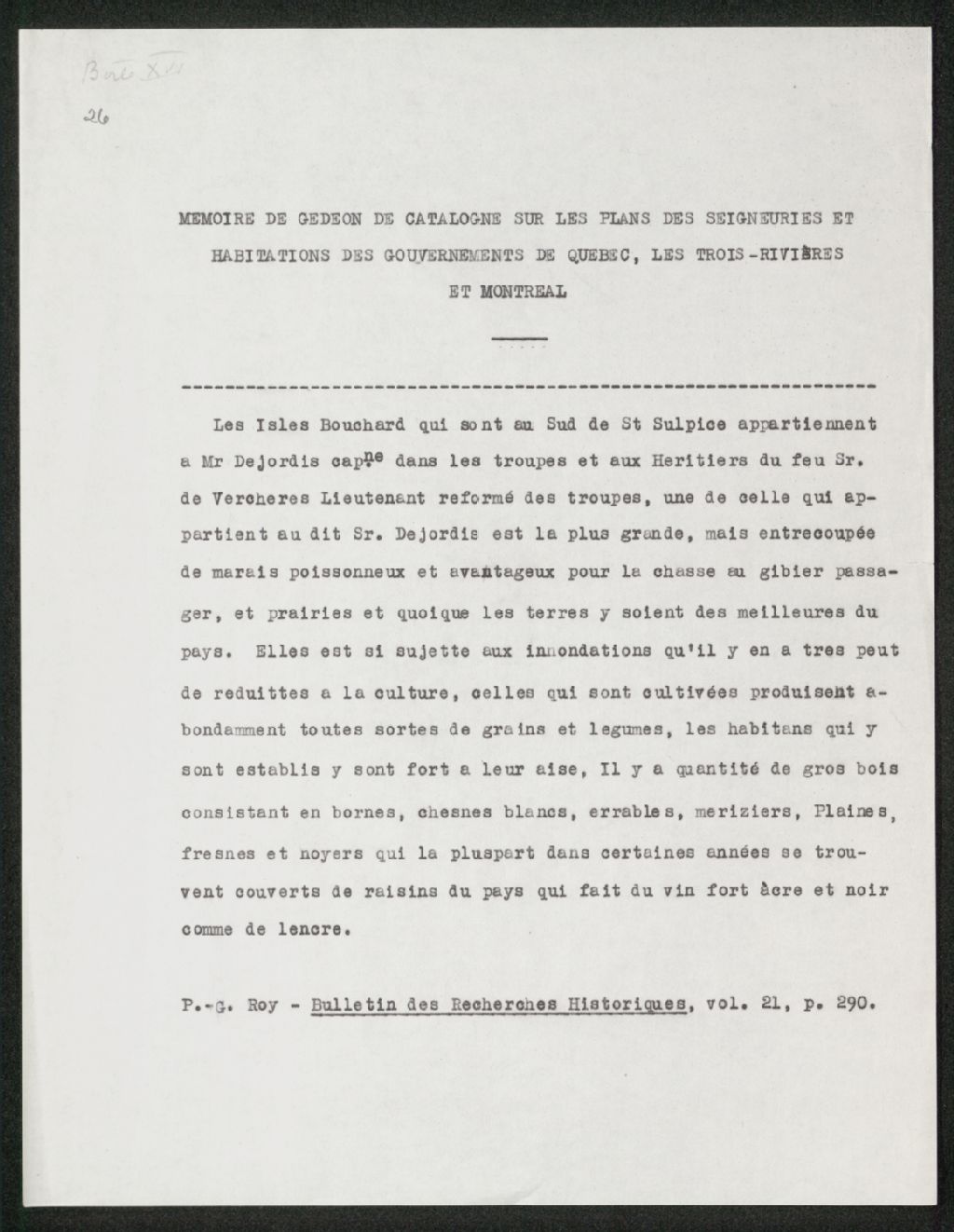 Mémoire de Gédéon de Catalogne, sans date. Extrait du mémoire tel que publié dans le Bulletin des recherches historiques (BRH) (vol. 21, p. 290)