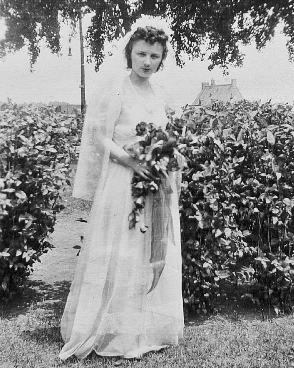 Reproduction d'une photographie prise lors du mariage de la cousine du père de Micheline Labranche. On peut la voir debout devant un arbuste en robe de mariée. Elle tient un bouquet de fleurs à la main.