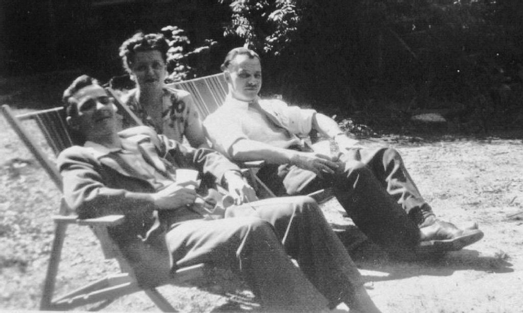 Reproduction d'une photographie d'un chef d'orchestre assis sur une chaise longue en compagnie des parents de Micheline Labranche. Ils sont sur une plage d'un chalet du Lac Beauport.