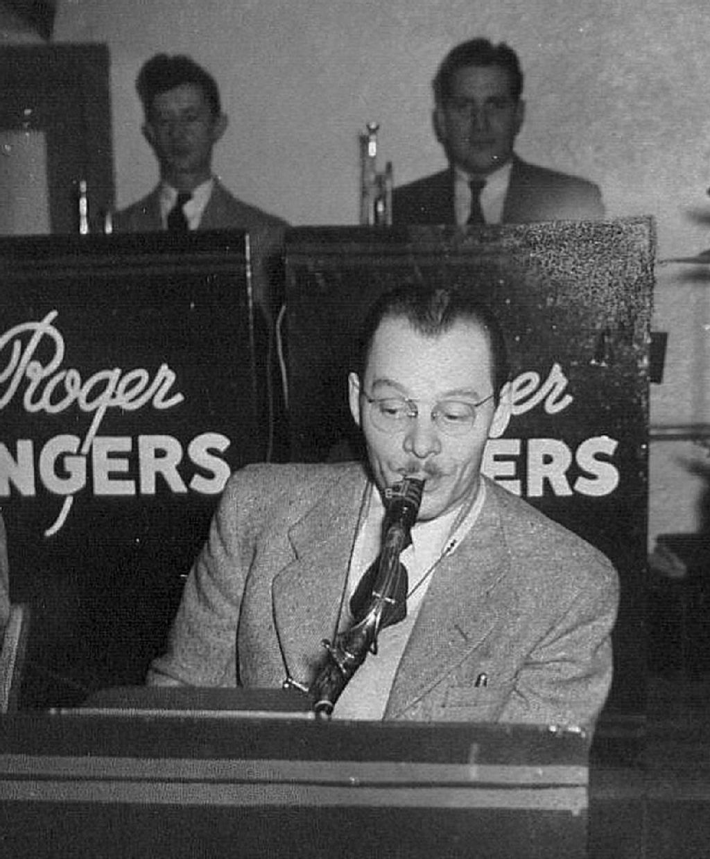 Photographie du père de Micheline Labranche qui joue du saxophone avec un orchestre à Québec. On peut voir deux musiciens assis derrière lui.