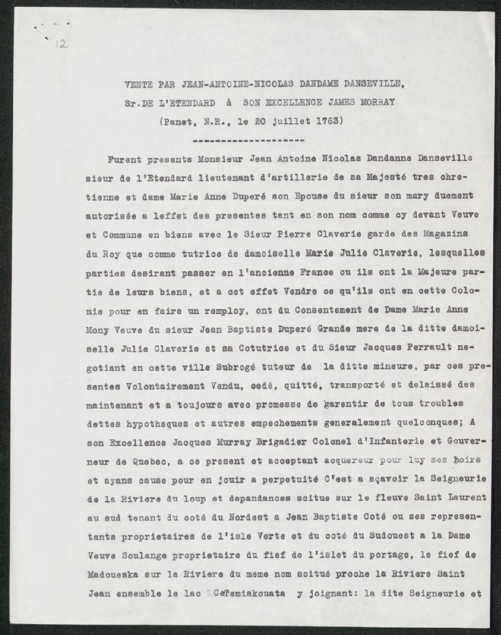 Vente par Jean-Antoine-Nicolas Dandame Danseville à James Murray, Copie dactylographiée en [19-] (original créé le 20 juillet 1763), Archives nationales à Québec, Collection Seigneuries, (03Q,P240,D247,P12).