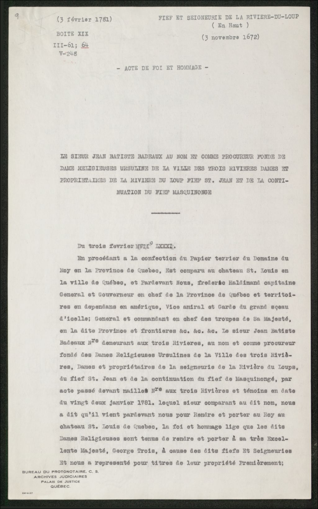 Acte de foi et hommage des Ursulines de Trois-Rivières, Copie dactylographiée en [19-] (original créé le 3 février 1781), Archives nationales à Québec, Collection Seigneuries, (03Q,P240,D248,P9).