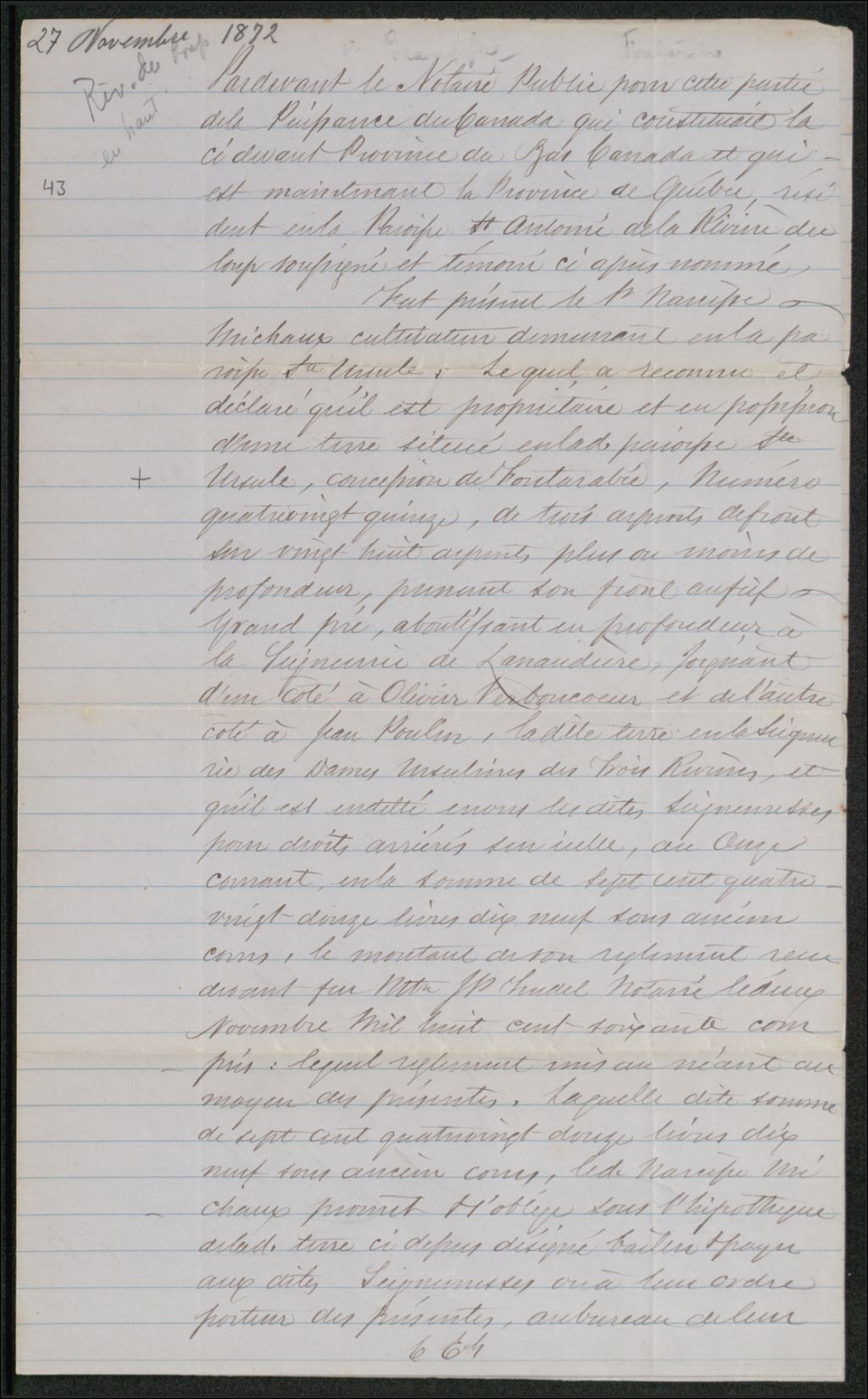 Obligation par Narcisse Michaud aux Ursulines de Trois-Rivières, 27 novembre 1872, Archives nationales à Québec, Collection Seigneuries, (03Q,P240,D248,P43).