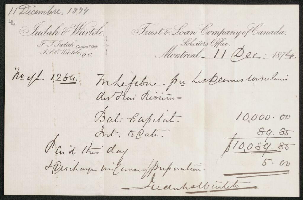 Reçu de J. Wurtele concernant M. Lefebvre et les Ursulines de Trois-Rivières