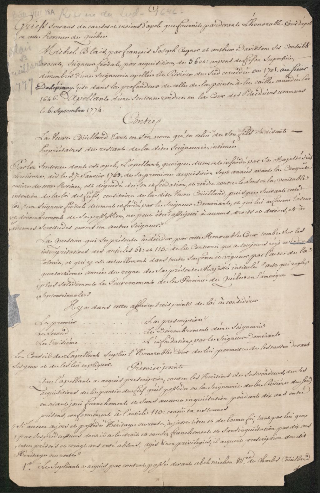 - Grief de Michel Blais et la veuve Couillard : "Griefs servans de causes et moiens d'apel que fournit par devant l'honorable cour d'apel en cette province de Quebec"