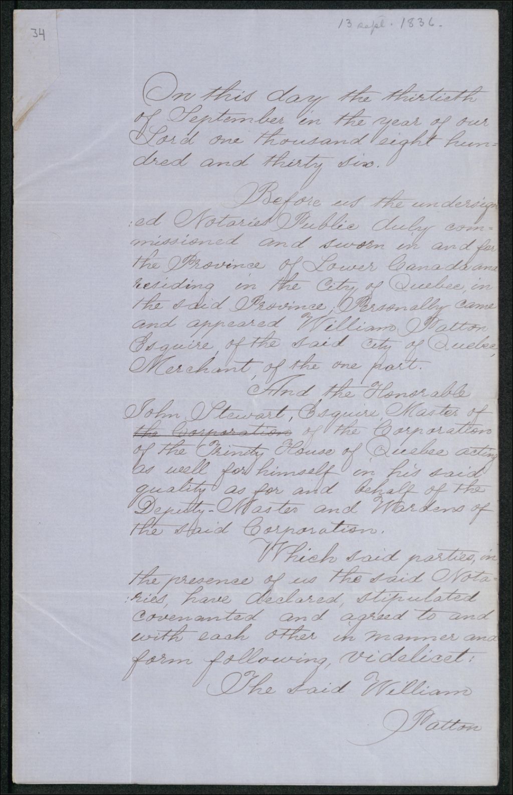 Obligation par William Patton à la Trinity House of Quebec, 30 septembre 1836, Archives nationales à Québec, Collection Seigneuries, (03Q,P240,D249,P34).
