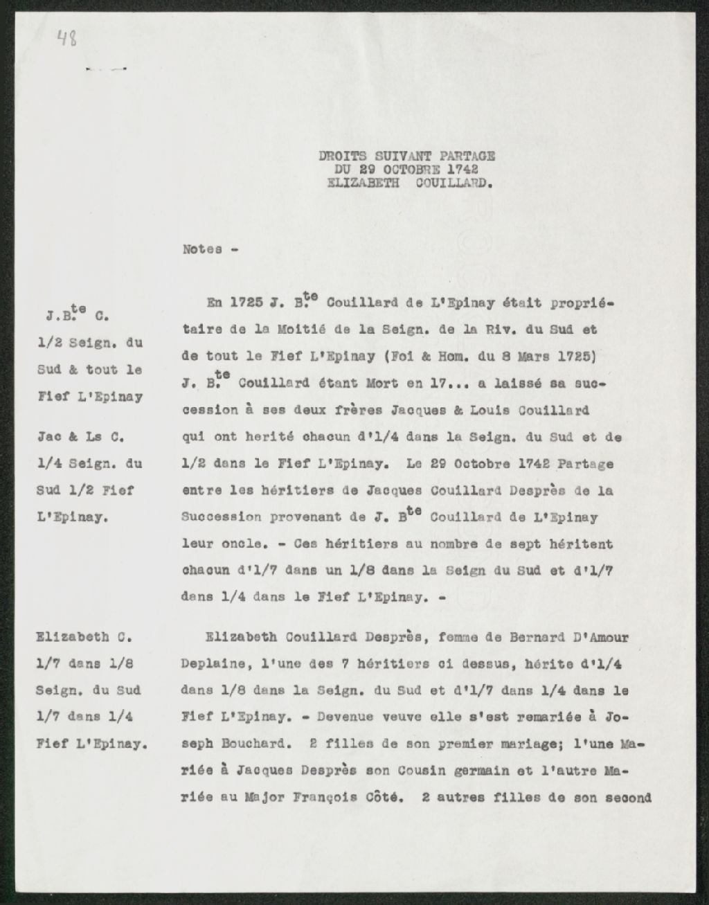 Documents de travail : Droits d'Élizabeth Couillard suivant le partage du 29 octobre 1742, Copie dactylographiée en [19-], Archives nationales à Québec, Collection Seigneuries, (03Q,P240,D249,P48).