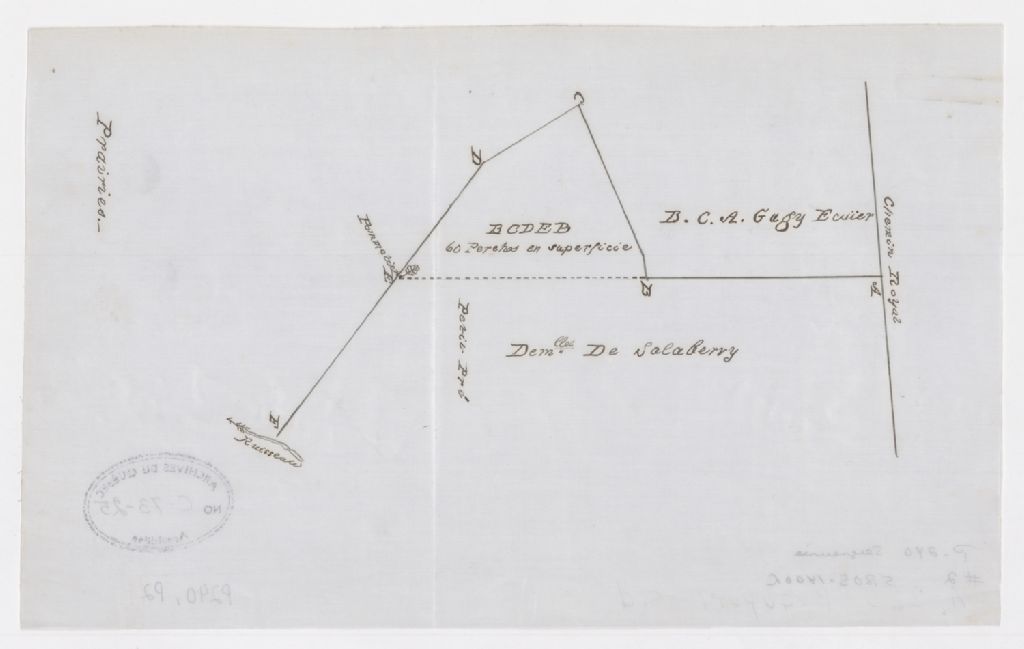Sur ce plan de la division du domaine de B. C. A Gugy et des Demoiselles de Salaberry situé dans la seigneurie de Beauport figurent une partie de cette seigneurie, le chemin Royal, la dimension d'un lot, les prairies et le ruisseau