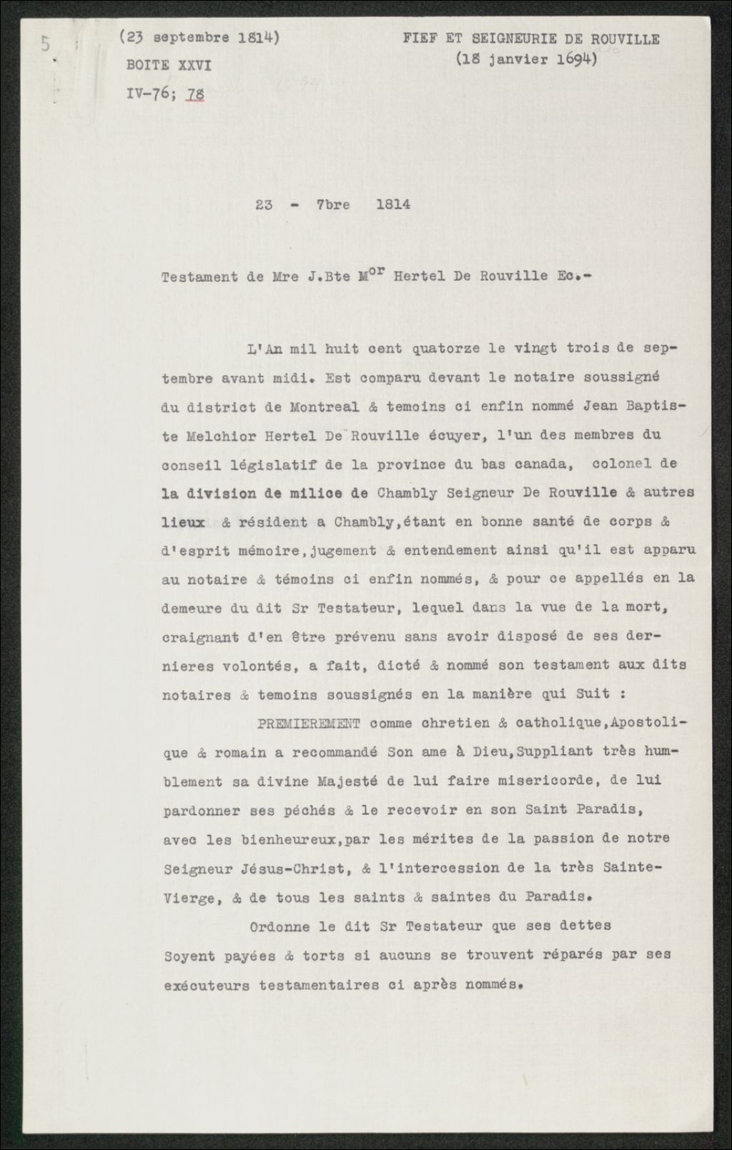 Testament de Jean-Baptiste Melchior Hertel de Rouville, Copie dactylographiée en [19-] original créé le 23 septembre 1814, Archives nationales à Québec, Collection Seigneuries, (03Q,P240,D257,P5).