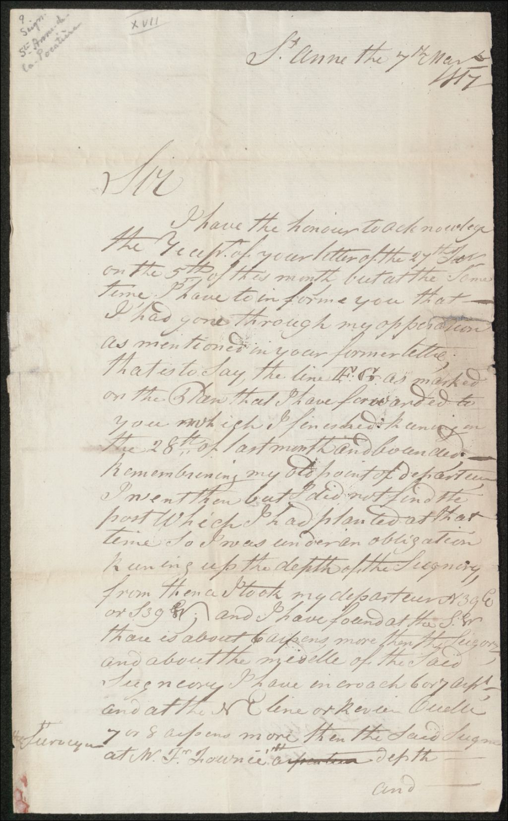 Lettre de Jeremiah McCarthy à Joseph Bouchette, 7 mars 1817, Archives nationales à Québec, Collection Seigneuries, (03Q,P240,D222,P9).