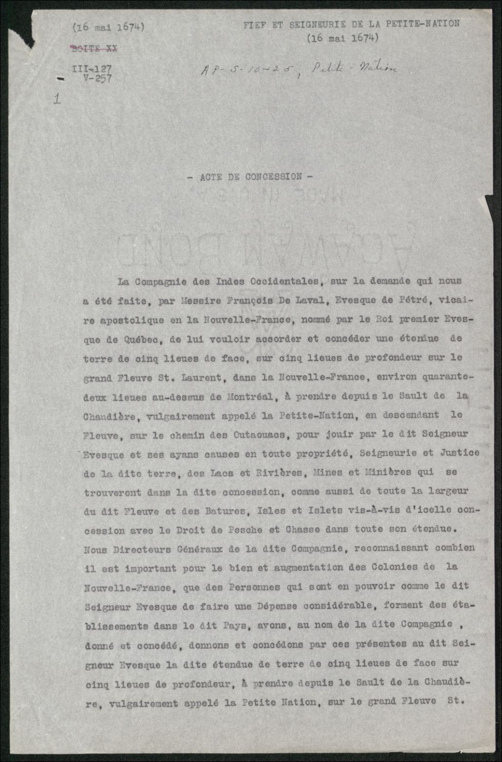 - Le titre complet de la pièce se lit comme suit : Acte de concession de la Compagnie des Indes Occidentales à messire François de Laval, évêque de Pétrée, vicaire apostolique de la Nouvelle-France, d'une "étendue de terre de cinq lieues de face sur cinq lieues de profondeur, à prendre depuis le sault de la Chaudière, vulgairement appelé la Petite-Nation, sur le grand fleuve Saint-Laurent, dans la Nouvelle-France, environ quarante-deux lieues au-dessus de Montréal, en descendant sur le chemin des Outaouais, pour le dit seigneur évêque et ses ayant-causes jouir à perpétuité de la dite terre en toute propriété, seigneurie et justice..."