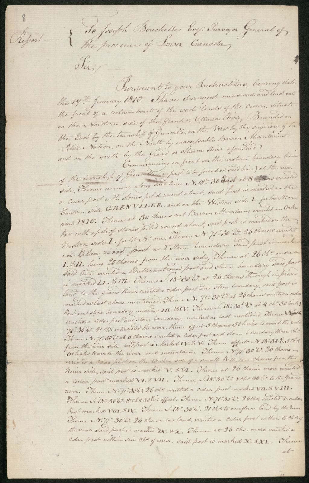 Rapport de Joseph Fortune, arpenteur, à Joseph Bouchette, 19 juin 1810, Archives nationales à Québec, Collection Seigneuries, (03Q,P240,D230,P8).