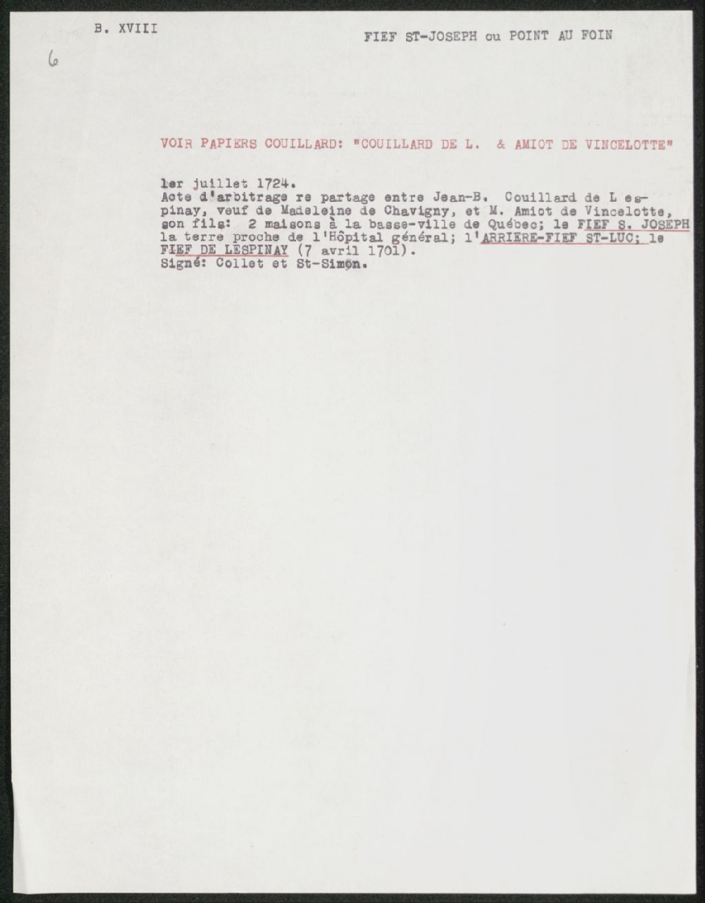 Documents de travail : Référence à l'acte d'arbitrage d'un partage de 1724, Copie dactylographiée en [19-], Archives nationales à Québec, Collection Seigneuries, (03Q,P240,D233,P6).