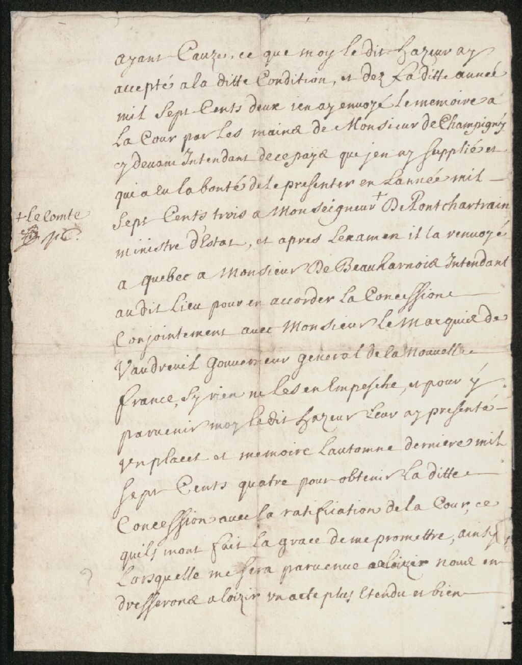 Le titre complet de la pièce se lit comme suit : Acte de société "Traitté de société" entre François Hazeur, conseiller au Conseil Souverain, et Pierre Constantin : " Nous François Hazeur, conseiller au Conseil Souverain de Québec, d'une part, et Pierre Constantin, habitant de ce pays, d'autre part, avons fait ensemble le traité de société qui en suit : c'est à savoir que le dit Constantin m'a proposé dès l'année mille sept cent deux les connaissances qu'il a du lieu nommé le Portachois, situé au nord norois de l'île de Terre-Neuve, qu'il irait lui-même établir pour y faire la pêche des morues, la chasse aux renards, caribous, ours, loups-marins, castors, loutres et autres animaux; traiter avec les sauvages, et pour le commerce avec les capitaines et autres gens des vaisseaux qui viennent annuellement tant de France que d'ailleurs en cet endroit et aux environs; icelui Constantin m'aurait requis de me joindre à lui pour en obtenir la concession de la cour par mon crédit et par mes amis, au moyen de quoi si nous l'obtenons cette concession appartiendra également à nous l'obtenons cette concession appartiendra également à nous deux et à nos successeurs et ayant causes, ce que moi le dit Hazeur ai accepté à la dite condition, et dès la dite année mille sept cent deux j'en ai envoyé le mémoire à la Cour par les mains de Monsieur de Champigny, ci-devant intendant de ce pays, que j'en ai supplié et qui a eu la bonté de le présenter en l'année mille sept cent trois à Monsieur le comte de Pontchartrain, ministre d'État, et après l'examen il l'a renvoyé à Québec à Monsieur de Beauharnois, intendant au dit lieu, pour en accorder la concession conjointement avec Monsieur le marquis de Vaudreuil, gouverneur général de la Nouvelle-France, si rien ne les en empêche, et pour y parvenir moi le dit Hazeur leur ai présenté un placet et mémoire l'automne dernière mille sept cent quatre pour obtenir la dite concession avec la ratification de la Cour, ce qu'ils m'ont fait la grâce de me promettre, ainsi lorsqu'elle me sera parvenue nous en dresserons à loisir un acte plus étendu et bien expliqué entre le dit Constantin et moi, celui-ci n'étant que par précaution entre lui et moi en cas de mort, promettant de nous garder fidélité l'un à l'autre, et de ne rien entreprendre que de concert, soit pour y envoyer ce printemps ou nom, en attendant que le dit établissement ou y envoyer une personne capable approuvée de nous deux, et encore bien que la dite concession soit demandée au nom de moi Hazeur, elle sera néanmoins également à nous deux comme il est ci-dessus mentionné; si pourtant nous trouvions des difficultés à former une société soit manque de moyens de part ou d'autre, ou en cas de mort et encore par d'autres raisons maintenant imprévues, il nous sera réciproquement libre à l'un et à l'autre d'y renoncer et de s"en démettre au profit de l'un de nous en s'accommodant ensemble par achat ou de la vendre ou donner à telle personne que nous aviserons bon être ; en foi de quoi nous avons signé, fait à Québec double le 16e janvier 1705 (signé) F.Hazeur, P. Constantin."